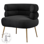 Experience the lap of luxury with the Ashley Chair. This stunning event furniture rental from the Ashley Collection sports a velvet fabric upholstery in black and a gold leg finish for an opulent, timeless look. This exquisite armchair will bring sophistication and beauty to your setting.